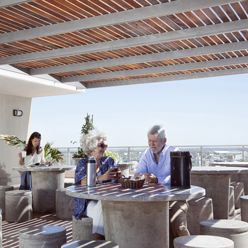 En planta baja, una explanada ambientada hace de expansión de salones, uno en cada torre, que pueden ser utilizados por los habitantes para reuniones con invitados externos, no interfiriendo con el uso y seguridad del edificio, ya que se ingresa de forma independiente desde la calle.