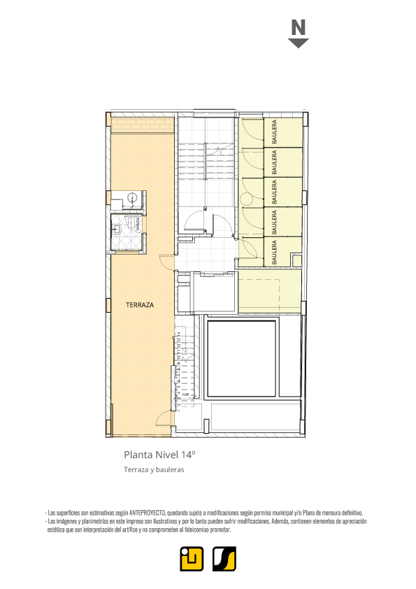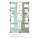 La propuesta resuelve en planta baja el Hall de ingreso del edificio y el acceso de vehicular a cocheras. Por encima de la planta baja se eleva la torre de departamentos con un desarrollo de 13 pisos habitacionales, según la siguiente distribución:
