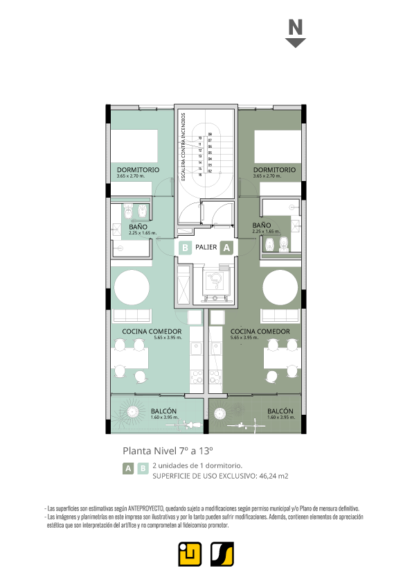 – Dpto. B – 1 Dormitorio: Sup. Propia 46,24m²